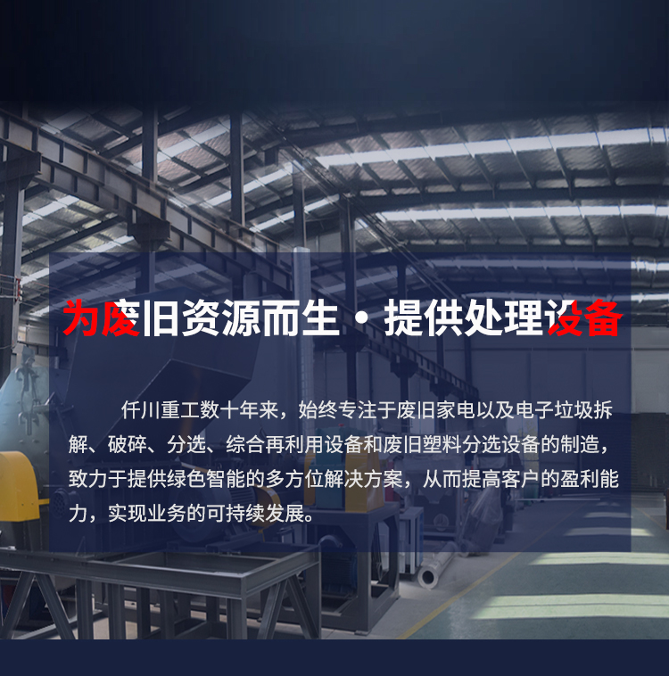 仟川重工數(shù)十年來,始終專注于廢舊家電以及電子垃圾拆解、破碎、分選、綜合再利用設(shè)備和廢舊塑料分選設(shè)備的制造,致力于提供綠色智能的多方位解決方案,從而提高客戶的盈利能力,實現(xiàn)業(yè)務(wù)的可持續(xù)發(fā)展。